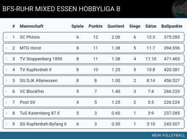 Volleyball Mixed 2 der DJK SG Altenessen. Wir haben die erste Saison im Liga-betrieb vor uns. Wir spielen in der BFS-Ruhr Mixed Essen Hobbyliga B. Hier sind viele die bereits Ballgefühl haben und sehr schnell Fort-schritte machen. Postionen und Läufersystem werden trainiert. Aber auch Feinschliff von Techniken sind noch Thema.